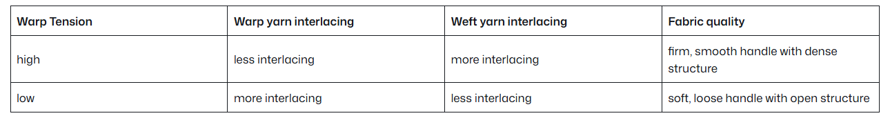 - With high tension, the warp threads are stretched, which can reduce the weft density due to limited space for weft insertion.